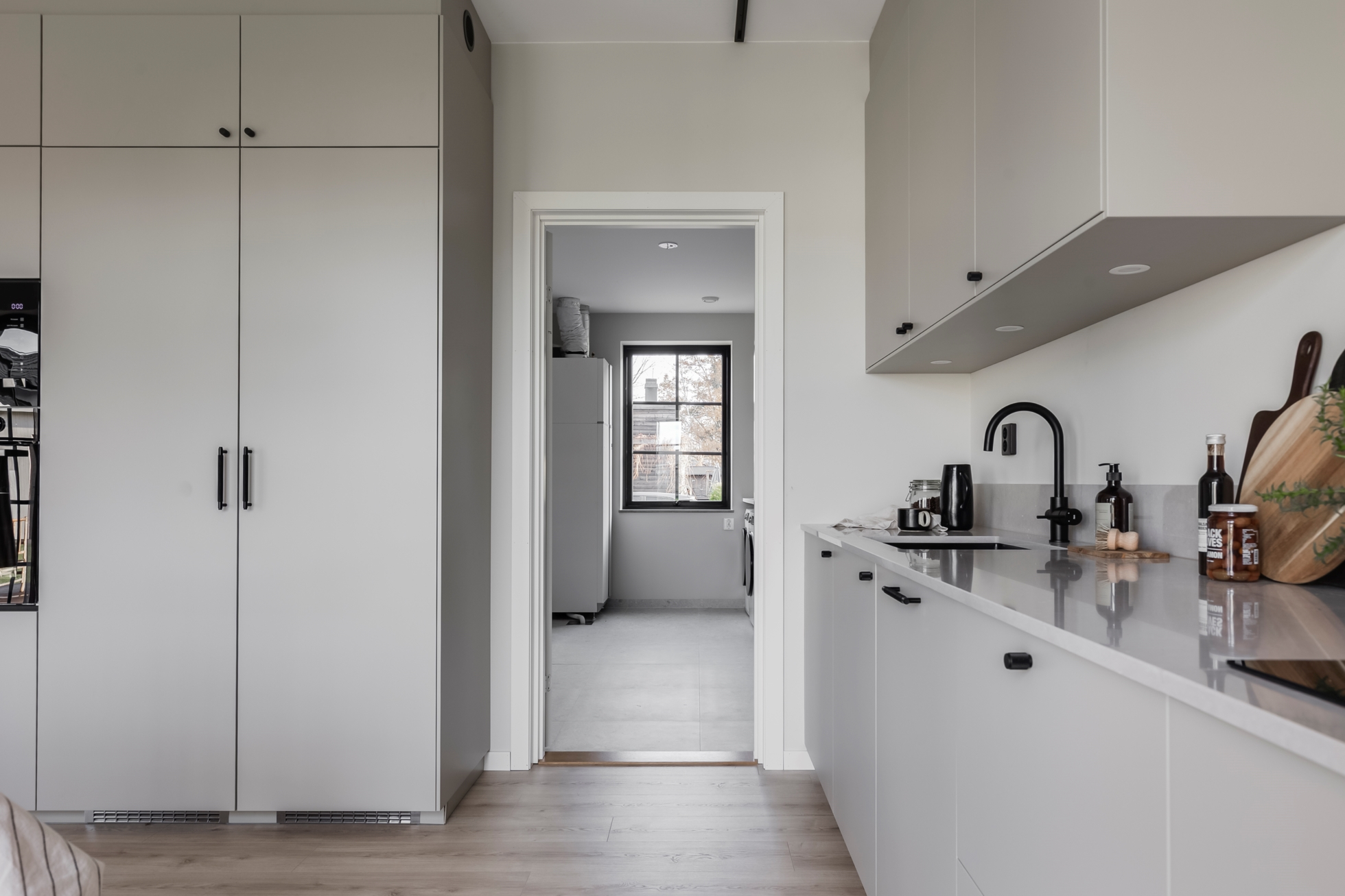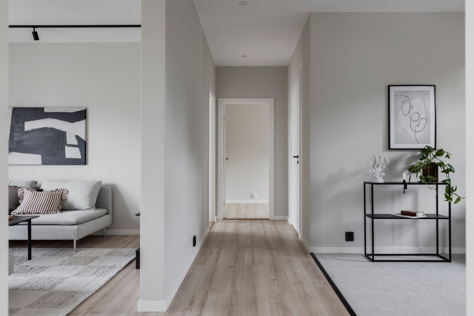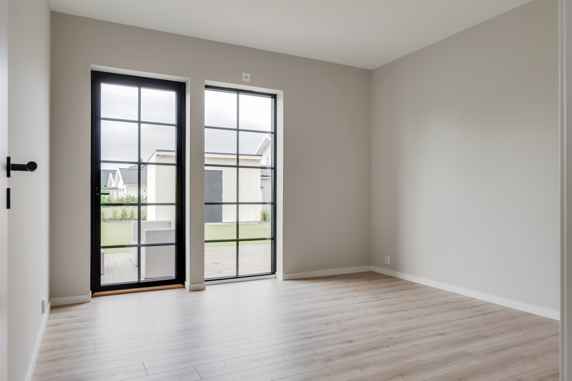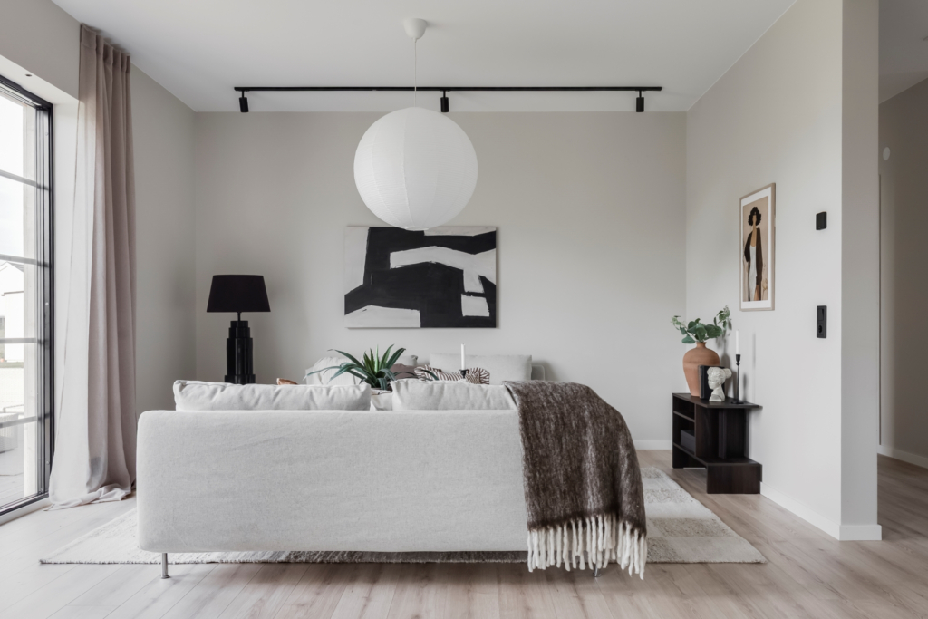 Interiören präglas av ljus, rymd och smakfulla materialval. De stora fönsterpartierna släpper in generöst med dagsljus och ramar in den lugna omgivningen. Här bor du nytt, bekvämt och bekymmersfritt – allt är färdigt från första dagen.