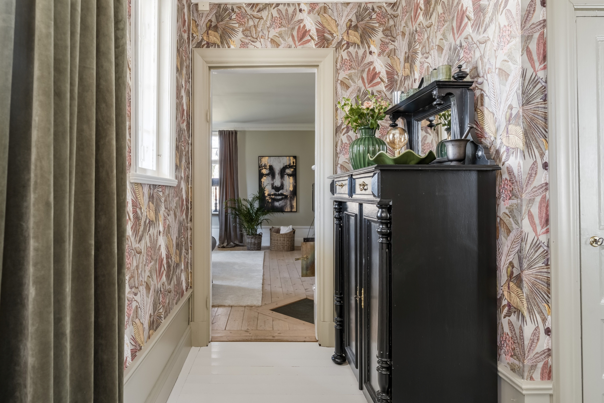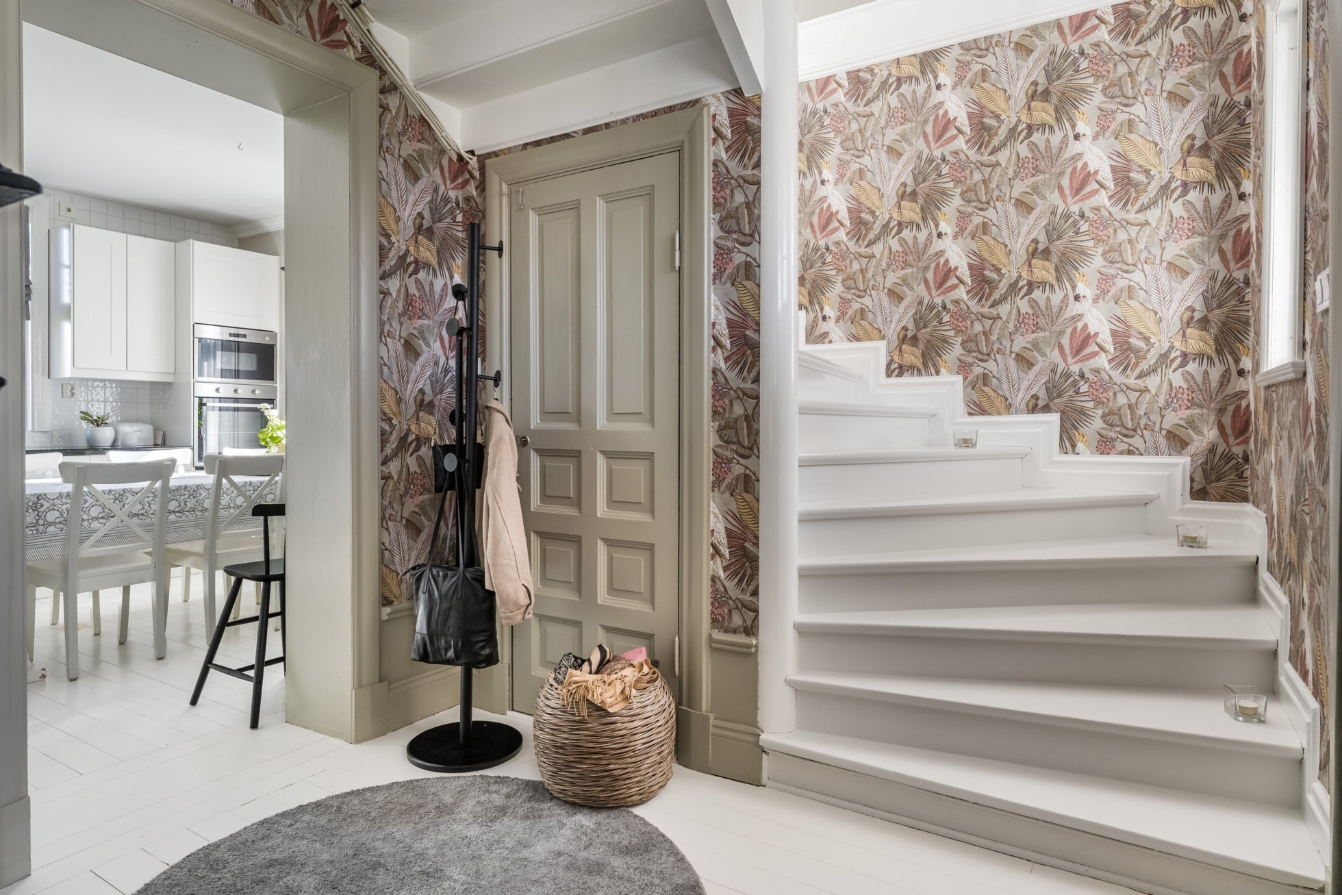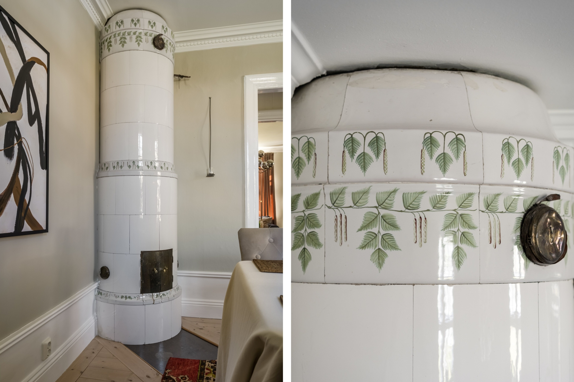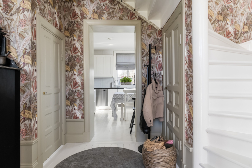 Entréplanet erbjuder ljusa och luftiga sällskapsytor med rymliga rum. På hela nedervåningen ligger nylagda massiva trägolv som ger en varm och gedigen känsla. Här möts du av en mysig hall där det idag finns en praktisk garderob, utrymmet har tidigare varit en gästtoalett och är fortfarande förberett med avlopp och vatten för den som önskar återställa WC. Från hallen nås ett generöst kök med plats för matgrupp. Vardagsrum med fönster i två väderstreck som ger ett härligt ljusinsläpp. Intill finns en matsal som även kan nyttjas som extra sovrum. De vackra kakelugnarna i båda rummen samt stuckaturer i taket bidrar till bostadens charm.