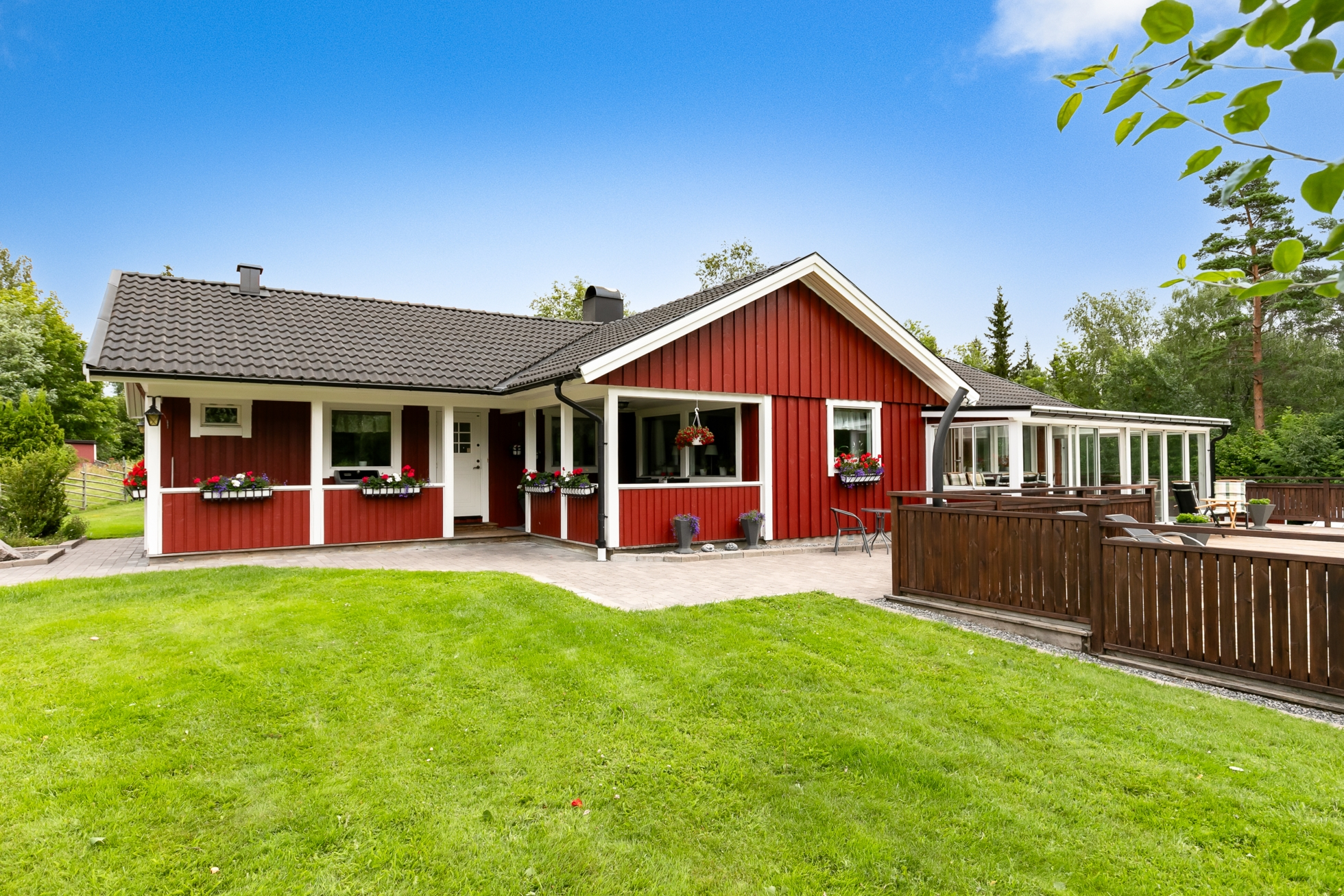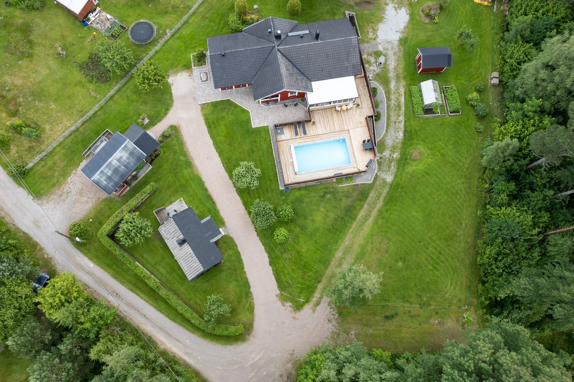 Här finns också ett maffigt poolområde som bjuder in till långa, lata sommardagar med svalkande dopp och härliga grillkvällar. Den stora trädgården med växthus är en grön oas för trädgårdsälskaren. Tillhörande garage som är rymligt med plats för mindre verkstad.