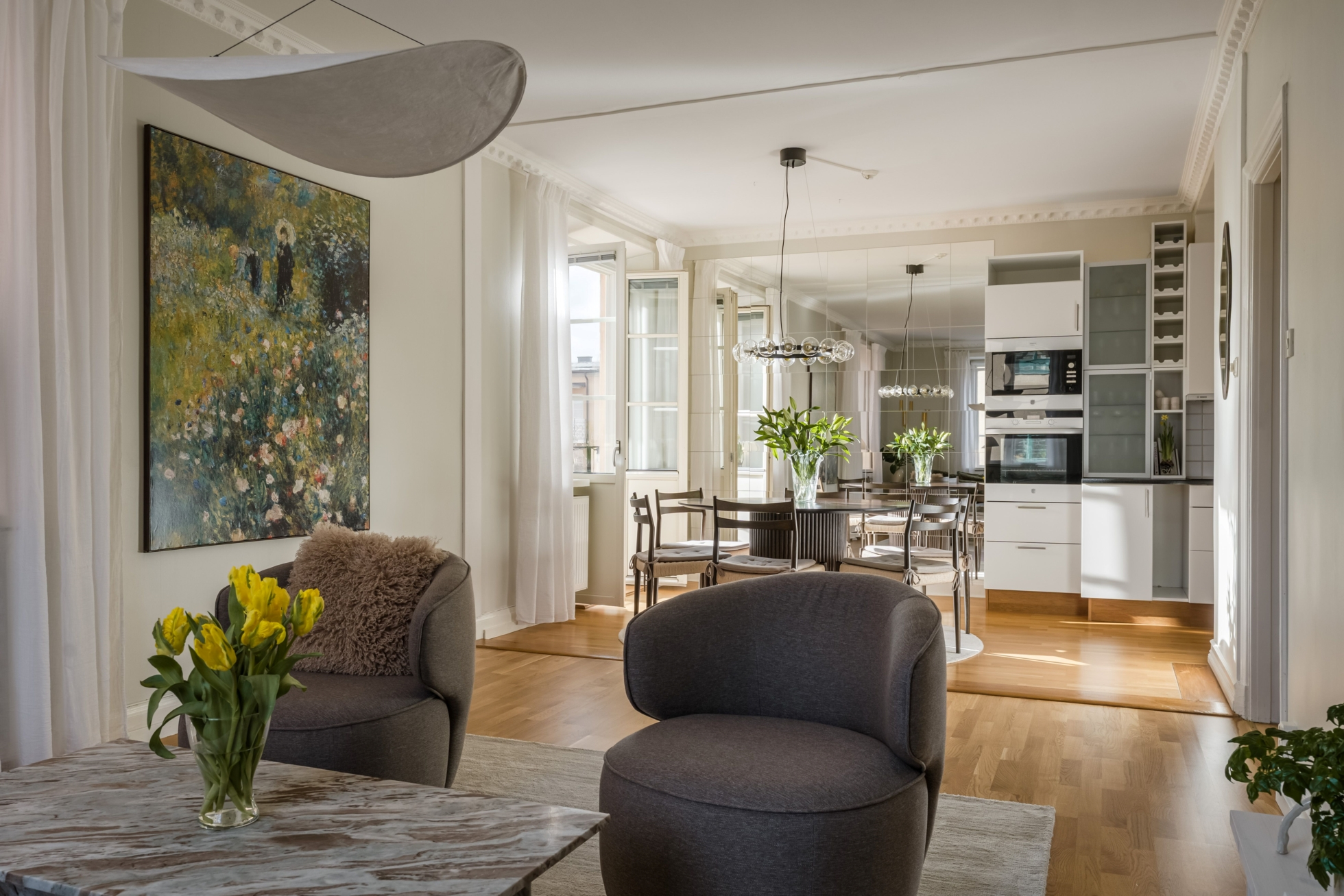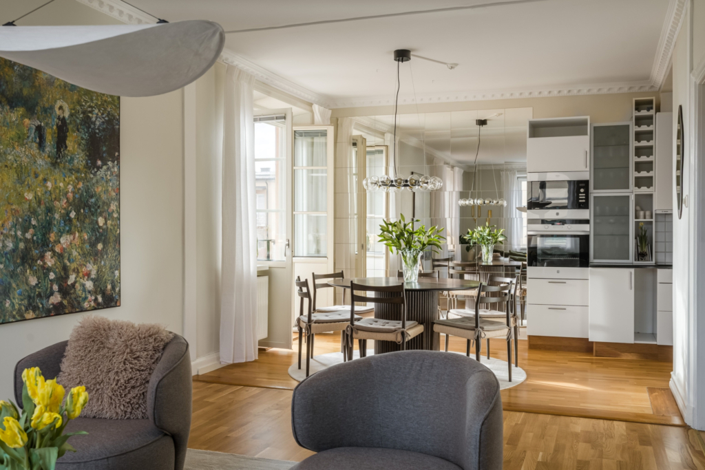 Utöver de generösa sällskapsytorna erbjuder lägenheten flexibla rum som passar lika bra som sovrum, arbetsrum eller gästrum. Bostaden är genomgående välhållen med en harmonisk känsla och praktiska lösningar som gör vardagen smidig.