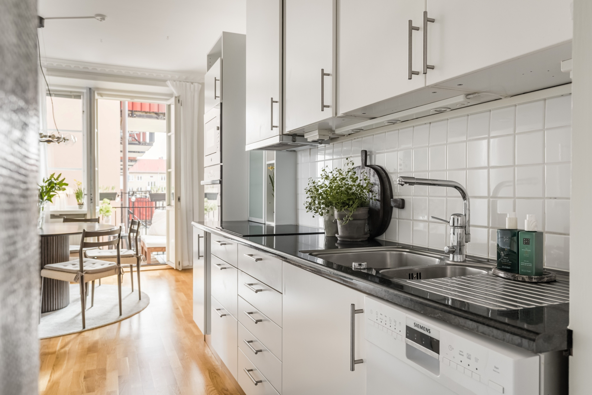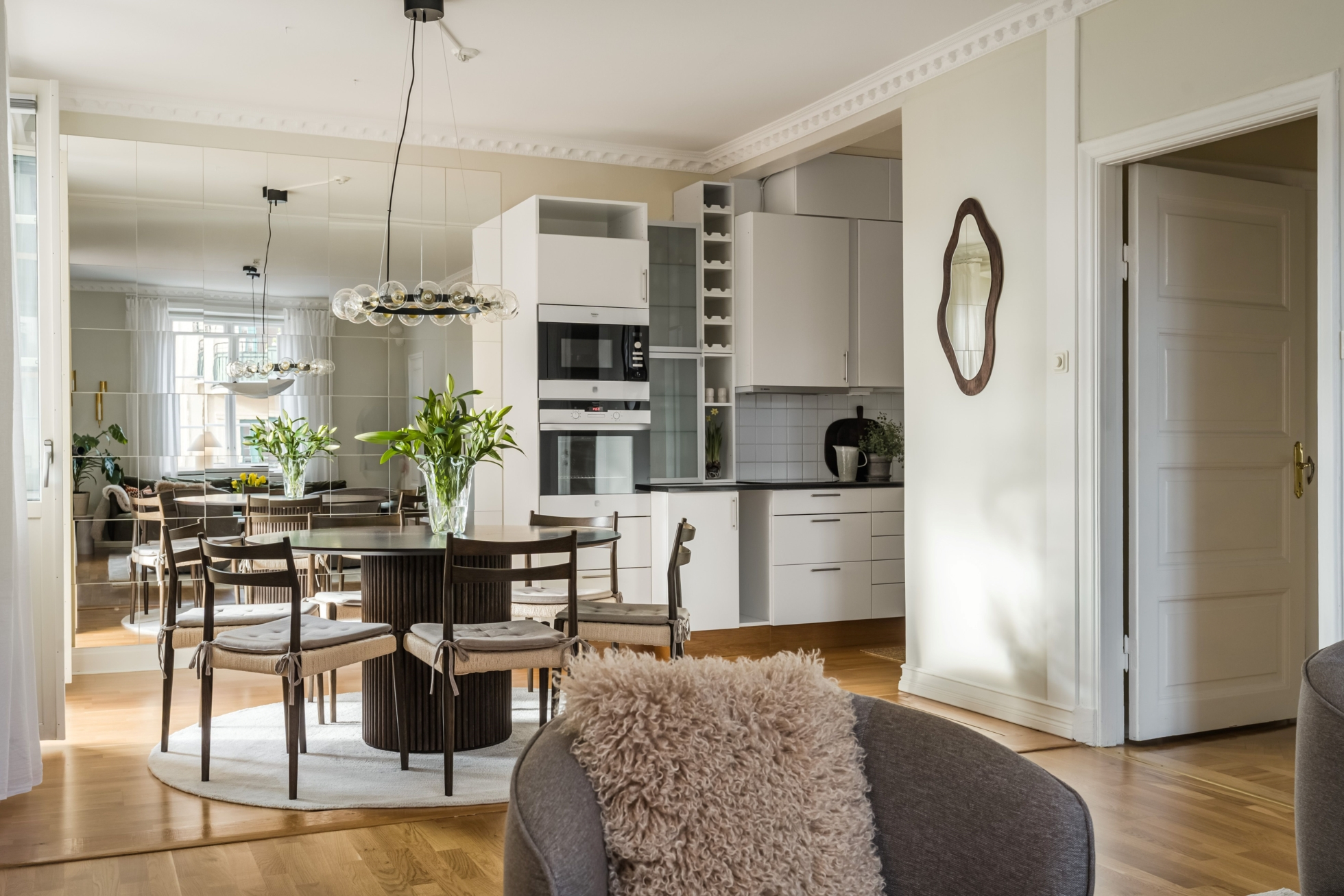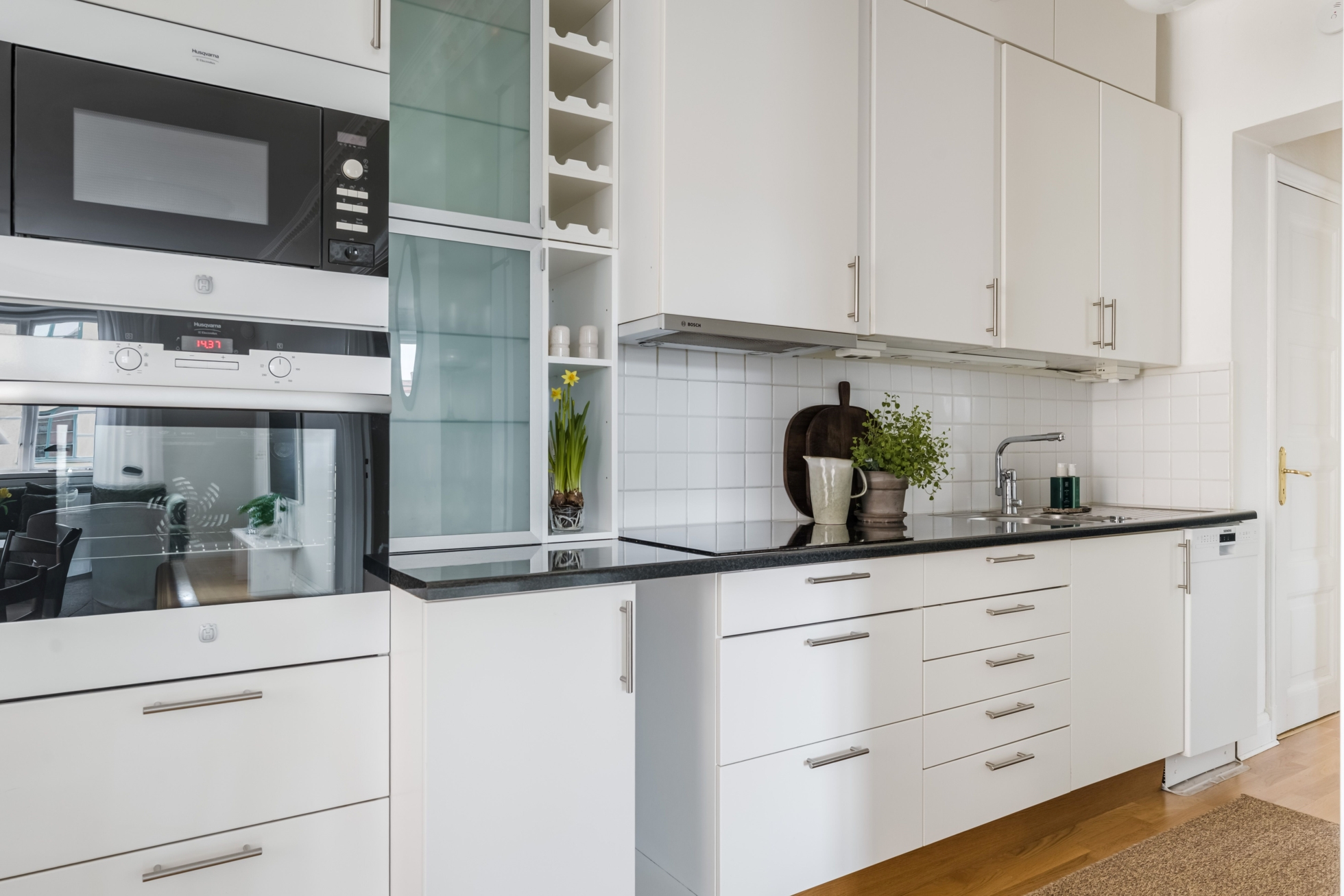 Bostadens kanske största styrka är den öppna planlösningen mellan kök och vardagsrum, en lösning som är ovanlig i den här typen av äldre fastigheter och som skapar en modern och social känsla. Här binds ytorna samman på ett naturligt sätt och ger gott om plats för både vardag och umgänge. Från denna del av bostaden når du även den fina balkongen, som blir en naturlig förlängning av rummet och erbjuder en trivsam plats för morgonkaffet, lugna kvällar eller sociala stunder under årets varmare månader.