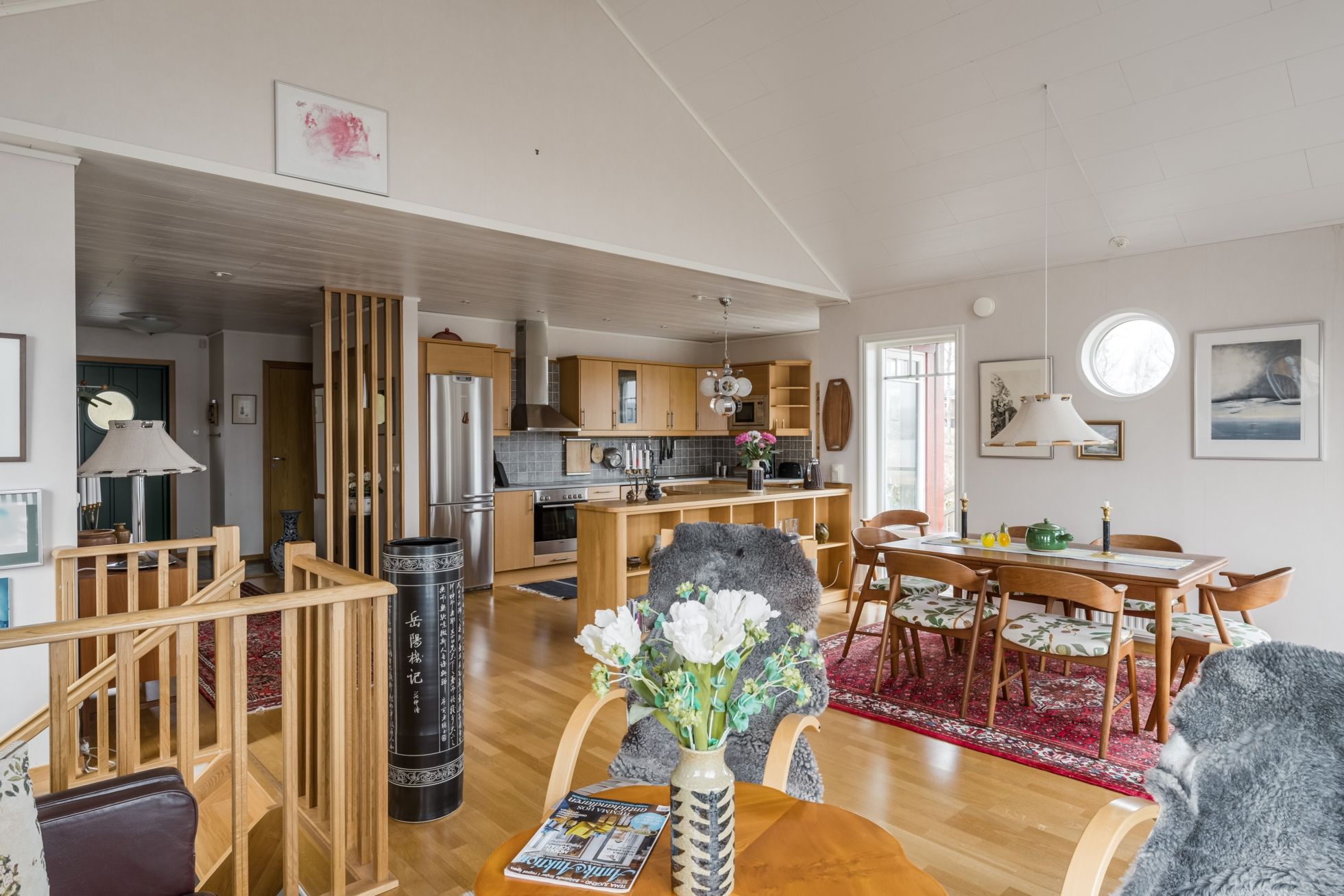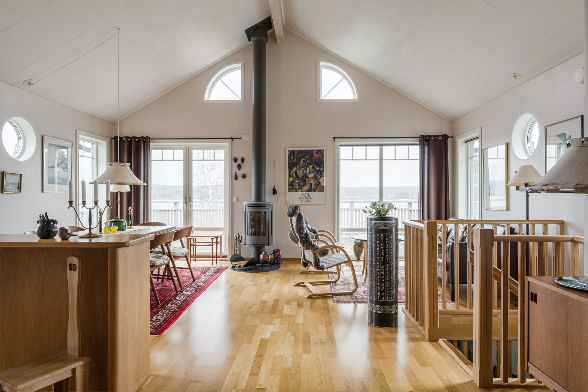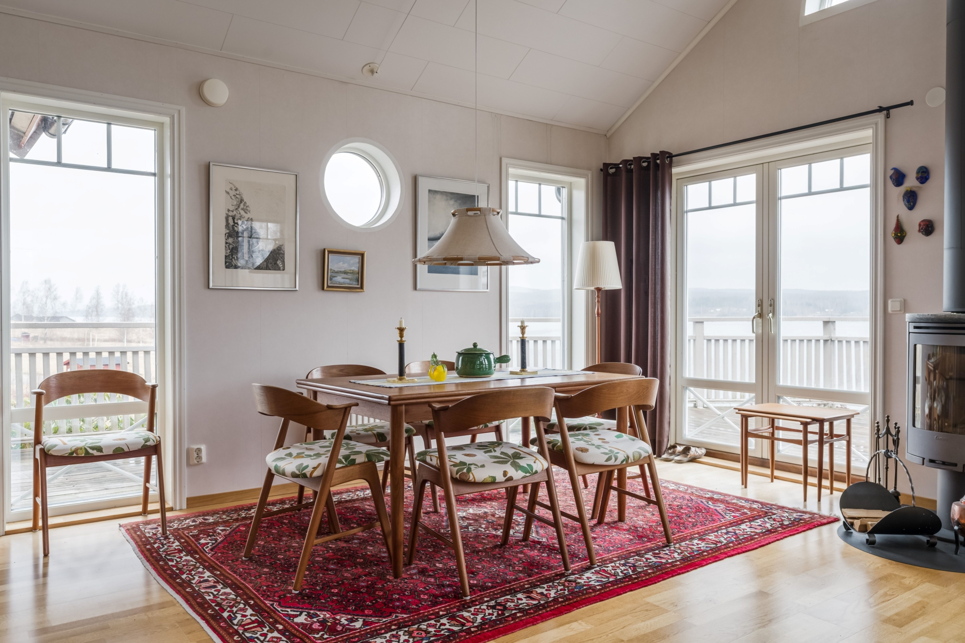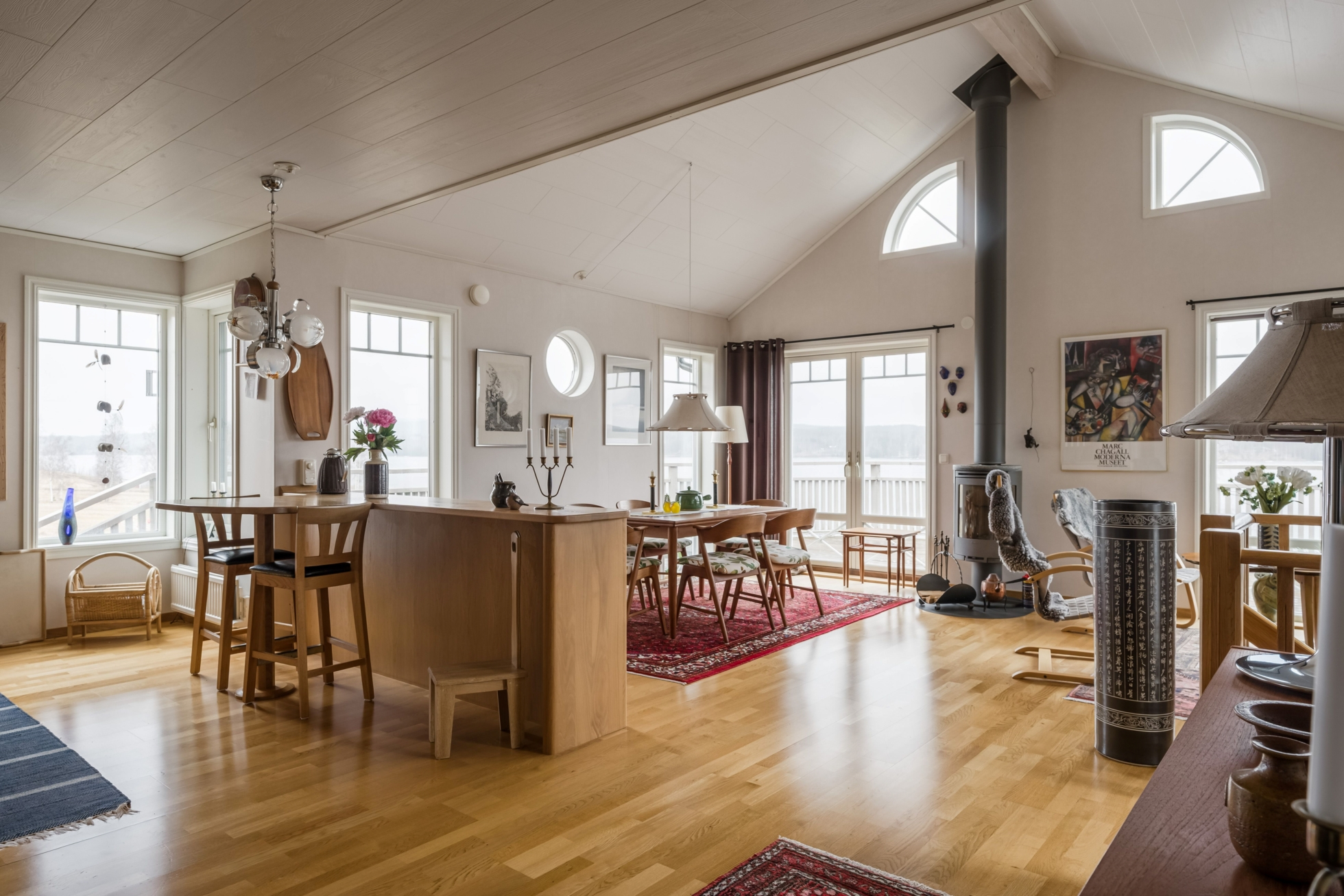 Husets hjärta är vardagsrummet där ryggåstak ger rymd och ljus, samtidigt som kaminen bidrar med värme och karaktär. Här finns gott om plats för både avkoppling och sociala sammanhang, och den öppna planlösningen mot köket skapar en naturlig samlingspunkt för familj och vänner. Den generösa matplatsen gör det enkelt att bjuda in till middagar med utsikt över sjön som fond.