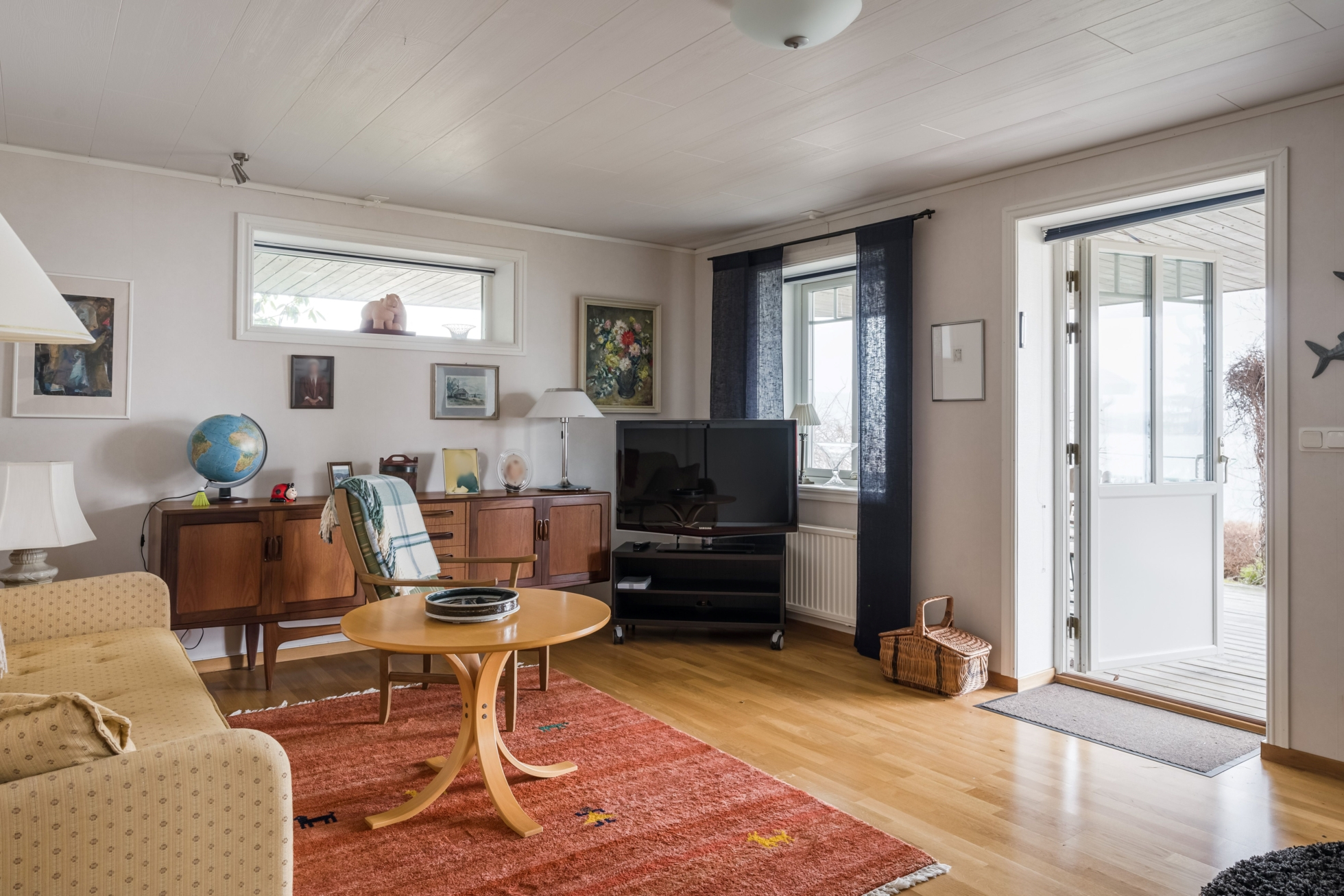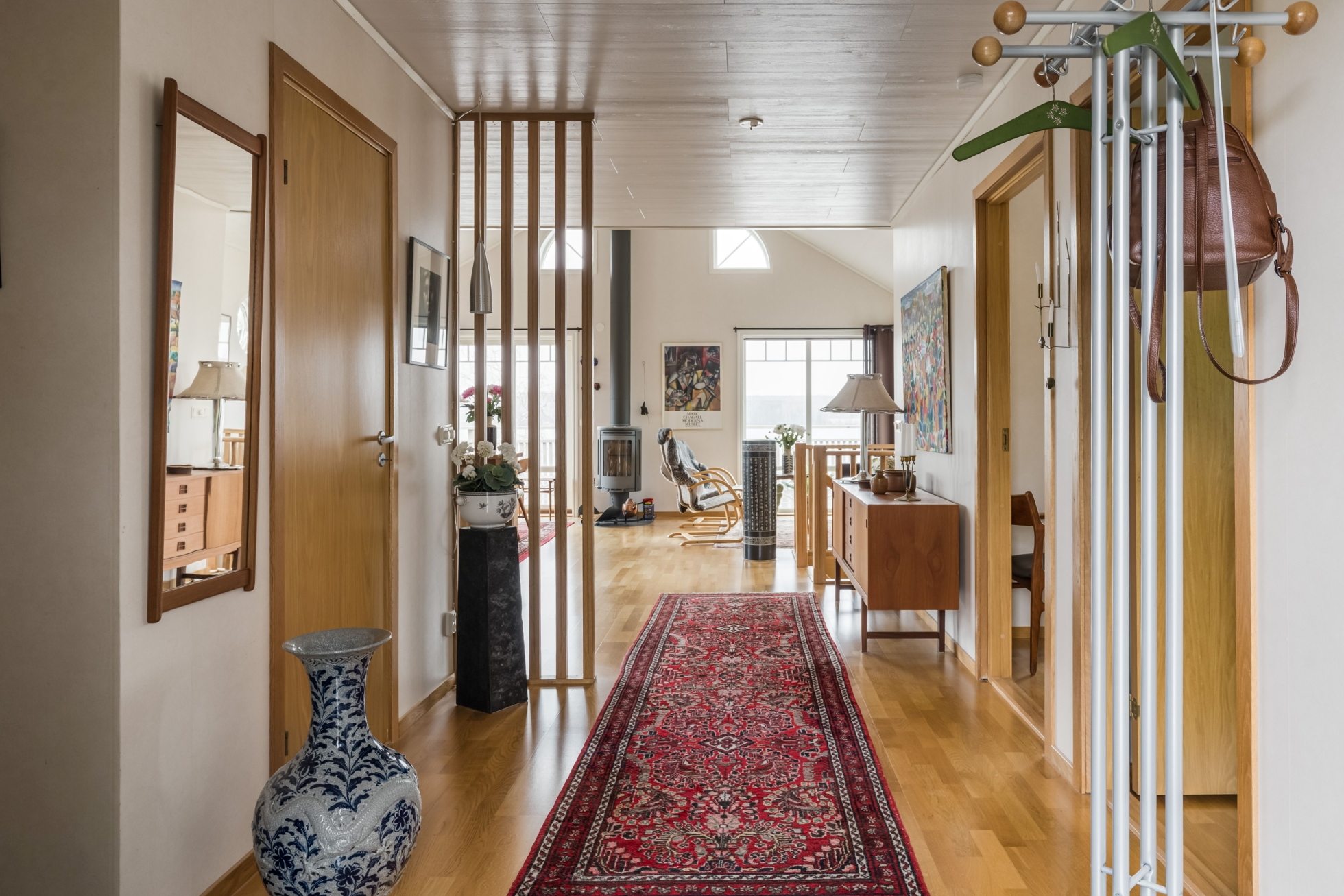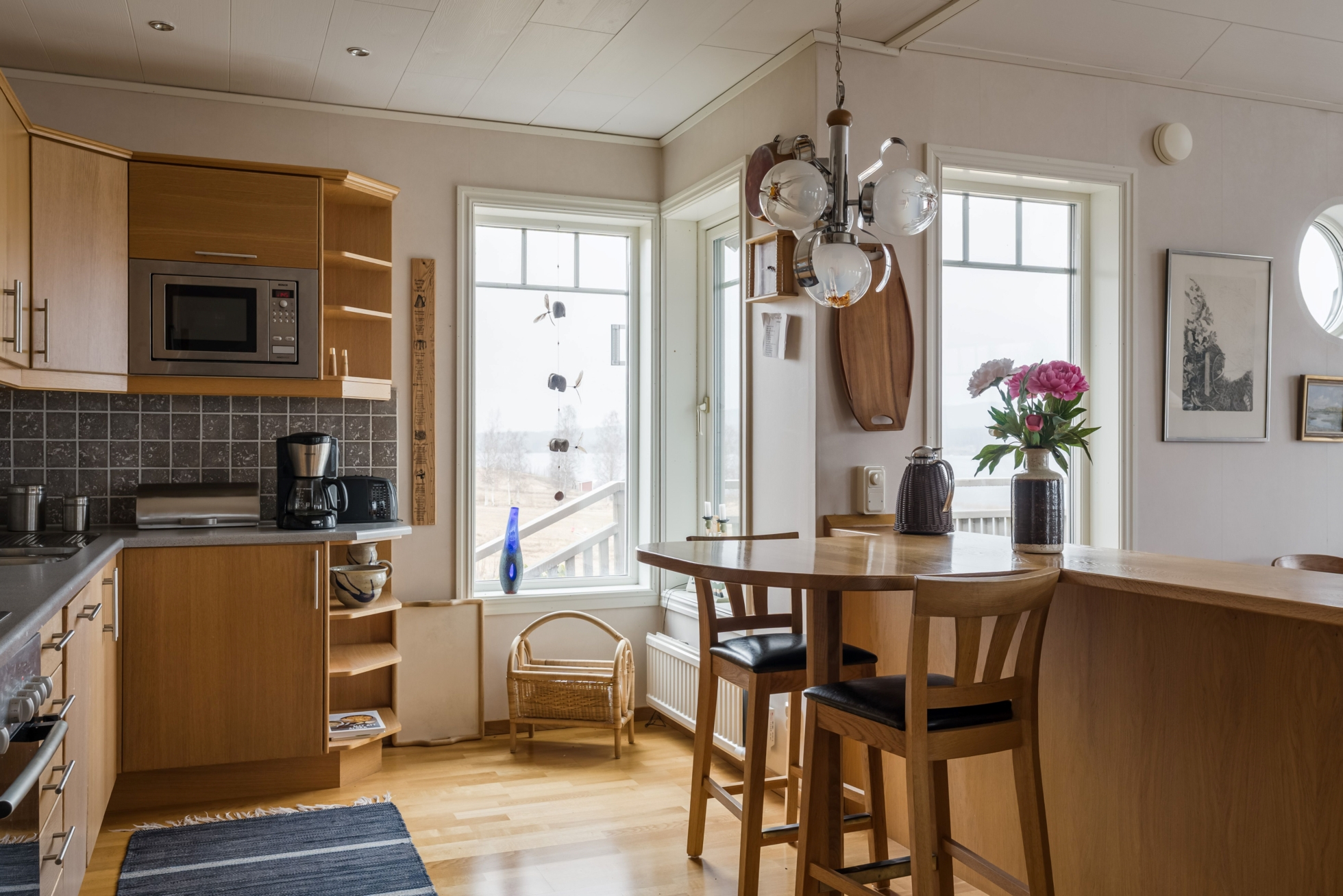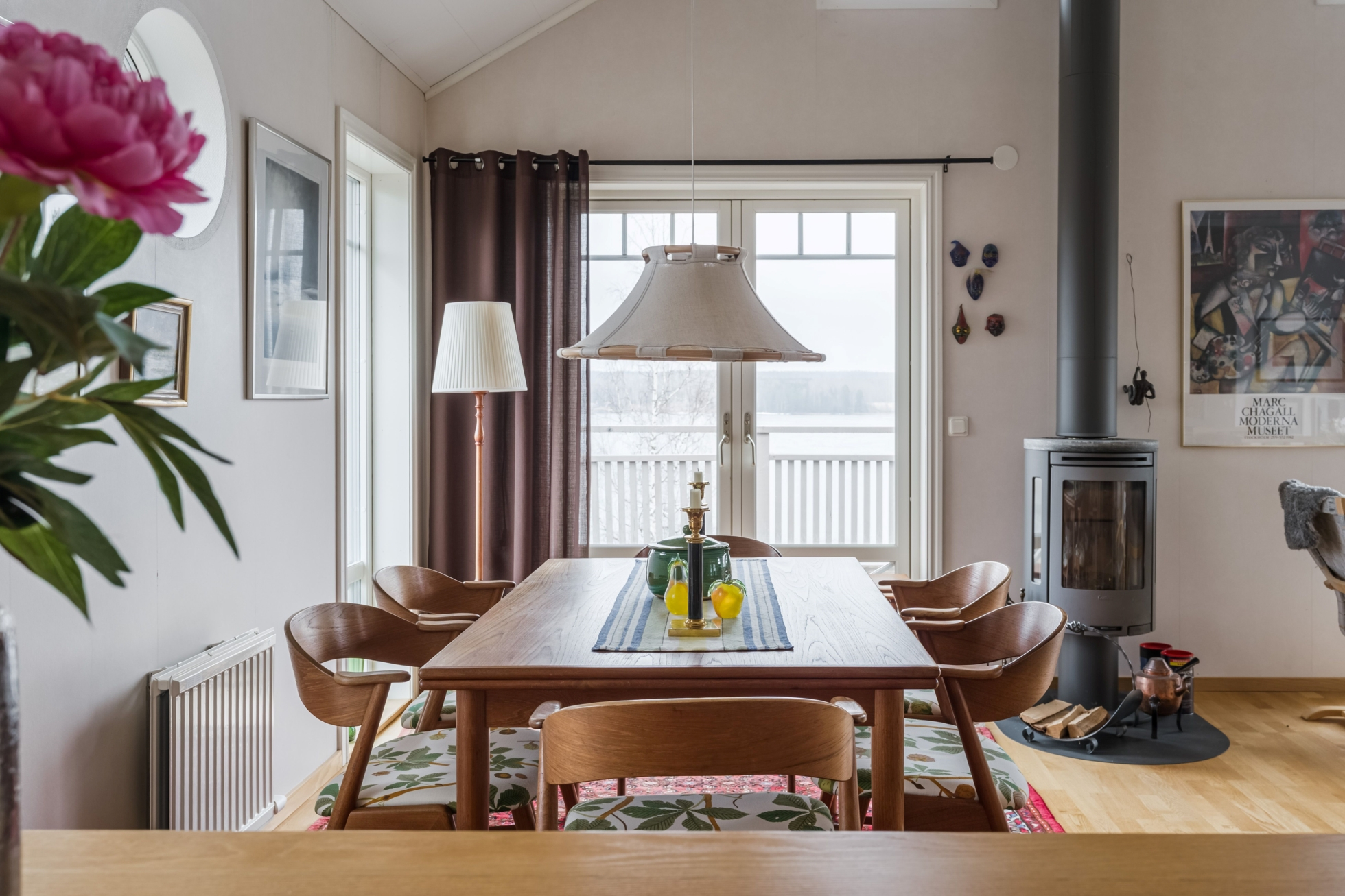 Husets hjärta är vardagsrummet där ryggåstak ger rymd och ljus, samtidigt som kaminen bidrar med värme och karaktär. Här finns gott om plats för både avkoppling och sociala sammanhang, och den öppna planlösningen mot köket skapar en naturlig samlingspunkt för familj och vänner. Den generösa matplatsen gör det enkelt att bjuda in till middagar med utsikt över sjön som fond.