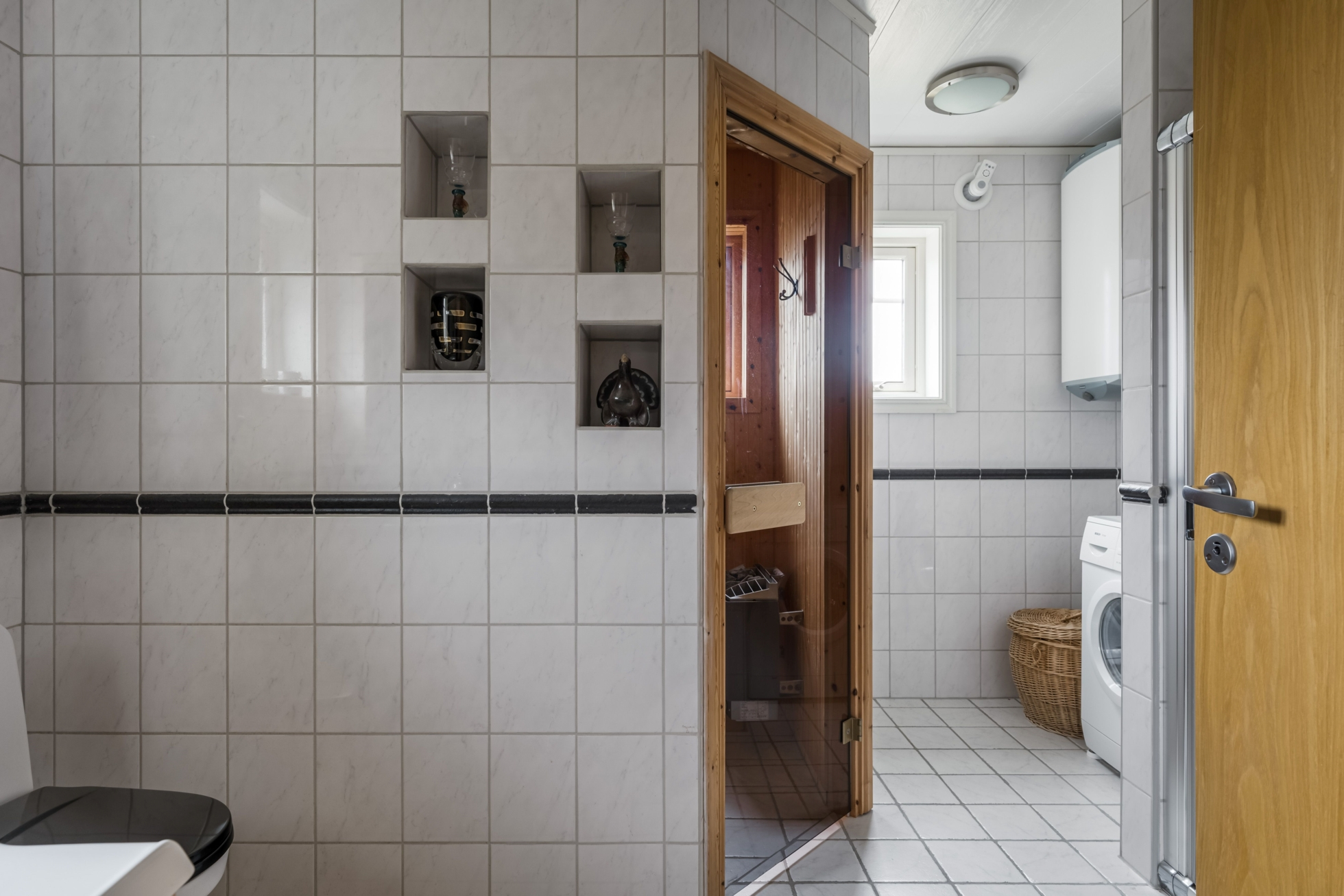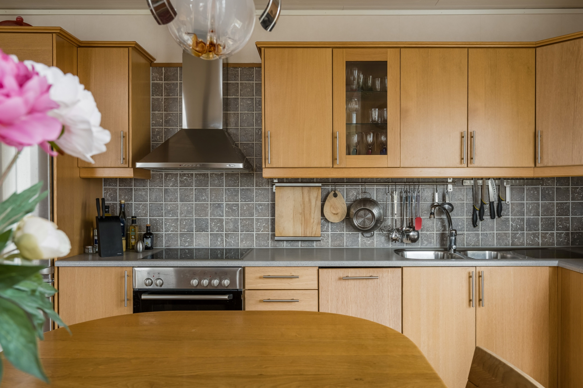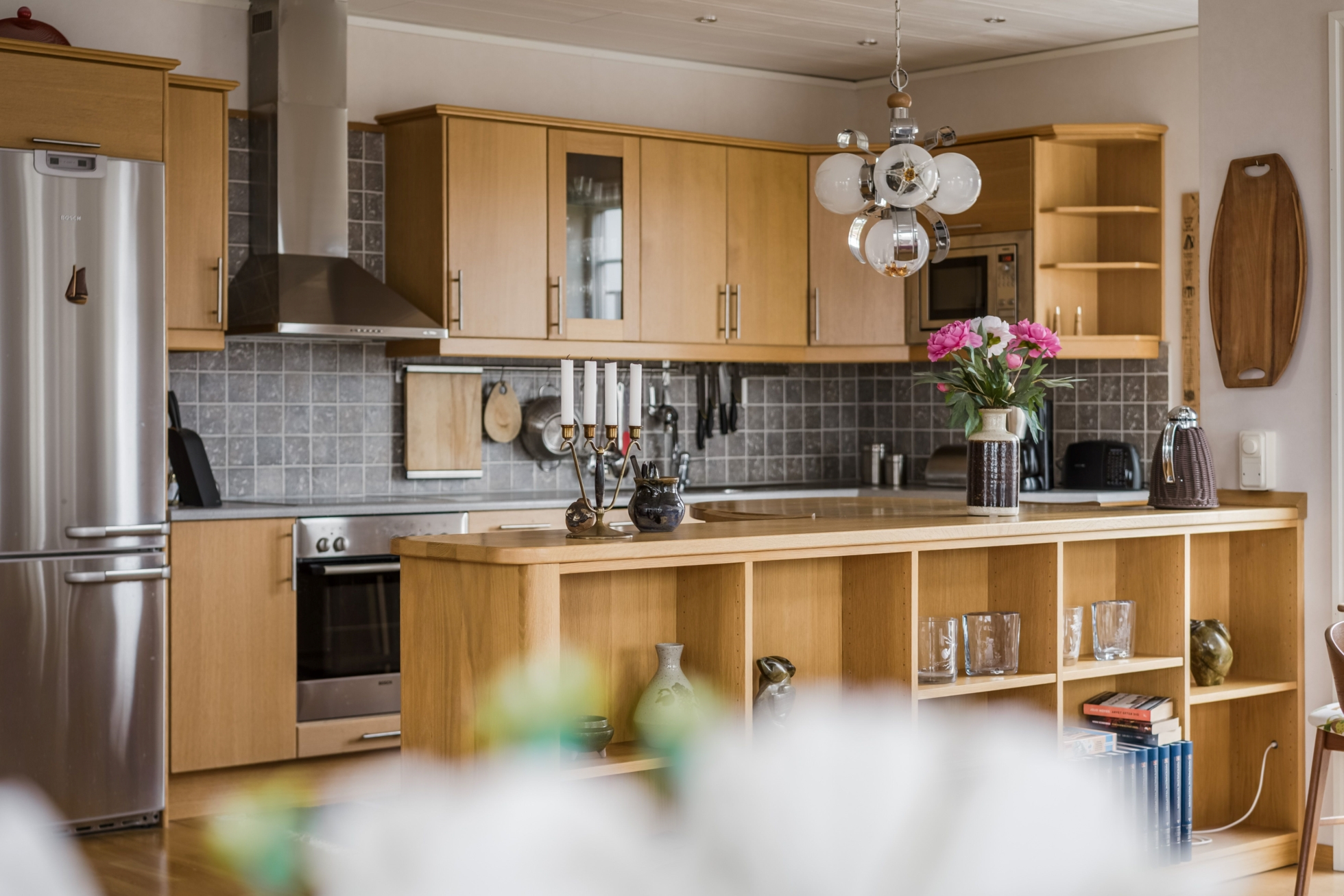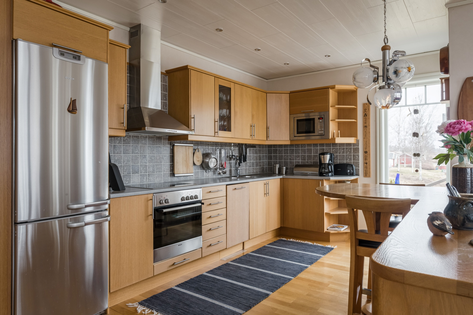 Husets hjärta är vardagsrummet där ryggåstak ger rymd och ljus, samtidigt som kaminen bidrar med värme och karaktär. Här finns gott om plats för både avkoppling och sociala sammanhang, och den öppna planlösningen mot köket skapar en naturlig samlingspunkt för familj och vänner. Den generösa matplatsen gör det enkelt att bjuda in till middagar med utsikt över sjön som fond.
